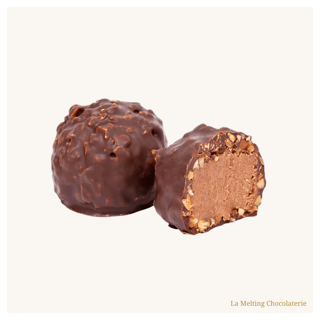 Découvrez des bouchées de rochers gourmands avec un délicieux praliné aux amandes et noisettes le tout enrobé d’un délicat chocolat au lait.